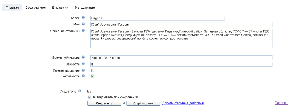 Создатель версии — в данном поле отображается время текущей версии и веб-корресподент который её создал. Данное поле сохраняется автоматически и отображается только в системе администрирования.