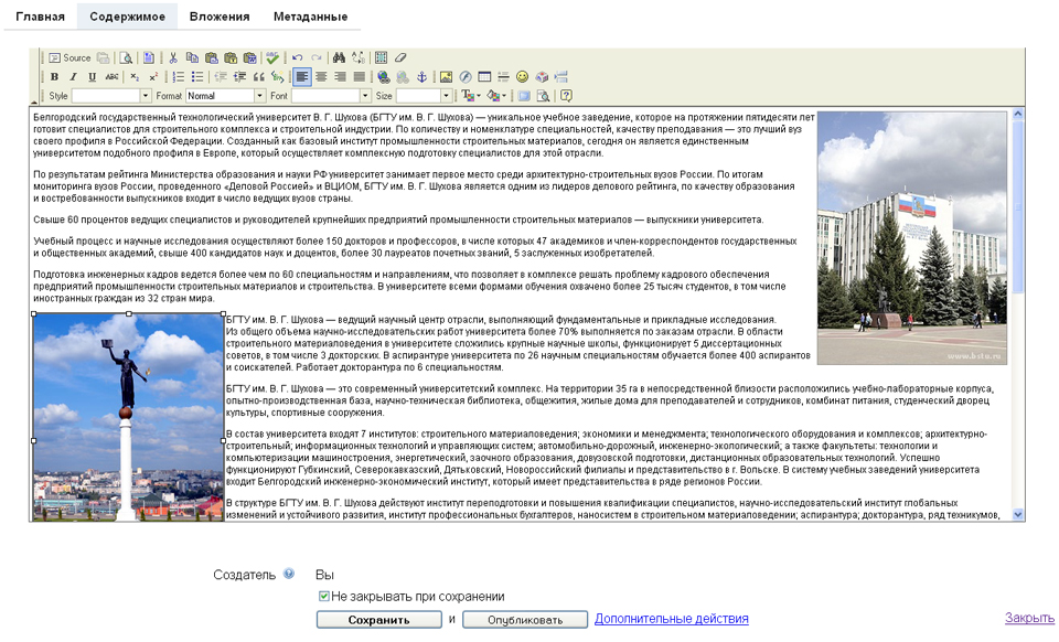 На сайте БГТУ им. В. Г. Шухова есть несколько вариантов размещения новостных материалов: