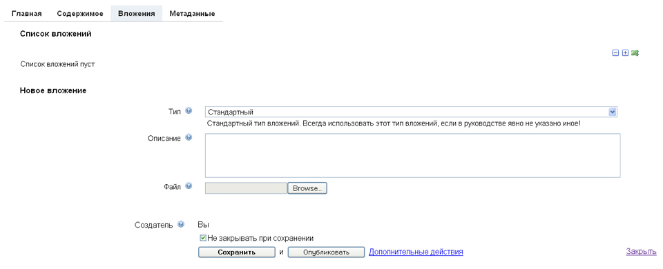В данной закладке отображается текущий список вложений, прикреплённых к данной странице, а так же форма для добавления нового вложения. Если у информационной сущности уже добавлены какие-либо вложения, то общее количество вложений отображается на панеле переключения закладок.