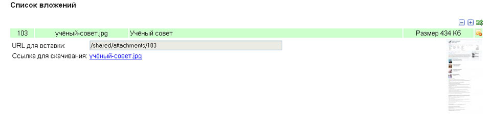 В прошлой версии системы администрирования было несколько форм для добавления вложений: в закладке «содержимое» и соответственно в закладке «вложения». Файлы, добавленные через форму в закладке «содержимое» использовались специальным образом, зачастую для создания миниатюры у новости.