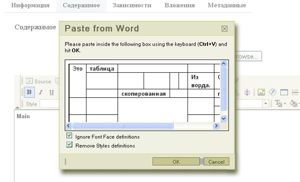 на закладке «содержимое» выбрать пункт «вставить из ворда»