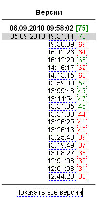 Номер версии отображается красным, если в данной версии флажок «активность» не выставлен, и зелёным если выставлен.